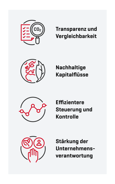 Transparenz und Vergleichbarkeit: Nachhaltigkeitsinformationen werden für Investoren, Geschäftspartner und die Öffentlichkeit leichter zugänglich, verlässlich und miteinander vergleichbar gemacht.