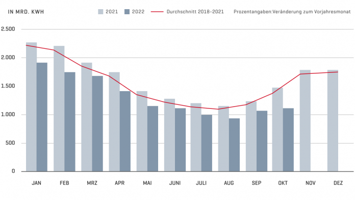 Im Vergleich zum Vorjahr ist der monatliche Gasverbrauch der Industriekunden in Deutschland laut der Bundesnetzagentur deutlich gesunken. Während in den Sommermonaten sowieso weniger Gas verbraucht wird, bleiben auch die Werte für den Gasverbrauch in den Herbstmonaten September und Oktober weit unter dem Vorjahreswert.