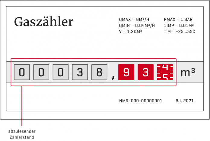 Den Gaszähler erkennen Sie außerdem auch am Ablesebereich bzw. Display des Zählers. Hier sollte die korrekte Einheit angegeben sein; bei Gaszählern ist dies Kubikmeter (m³).
