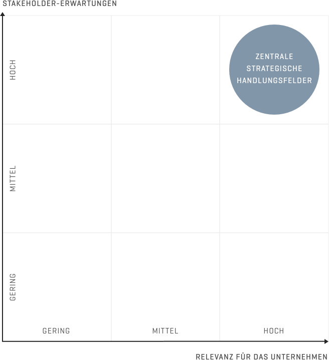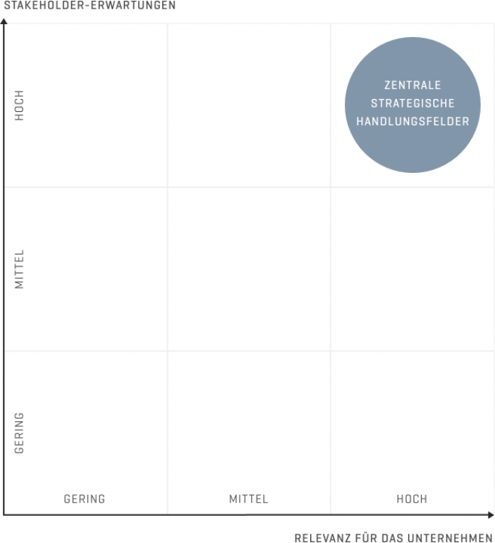 Auf Basis der Wesentlichkeitsanalyse ergeben sich je nach Unternehmen und Stakeholder unterschiedliche Handlungsfelder, welche die firmeninterne Nachhaltigkeitsstrategie maßgeblich mitbestimmen. Die Geschäftsführung oder ihre Nachhaltigkeitsteams nutzen die Handlungsfelder zum Beispiel als Grundlage zur Festlegung wichtiger KPIs oder zur Entwicklung strategischer Ziele und abzuleitender Maßnahmen.